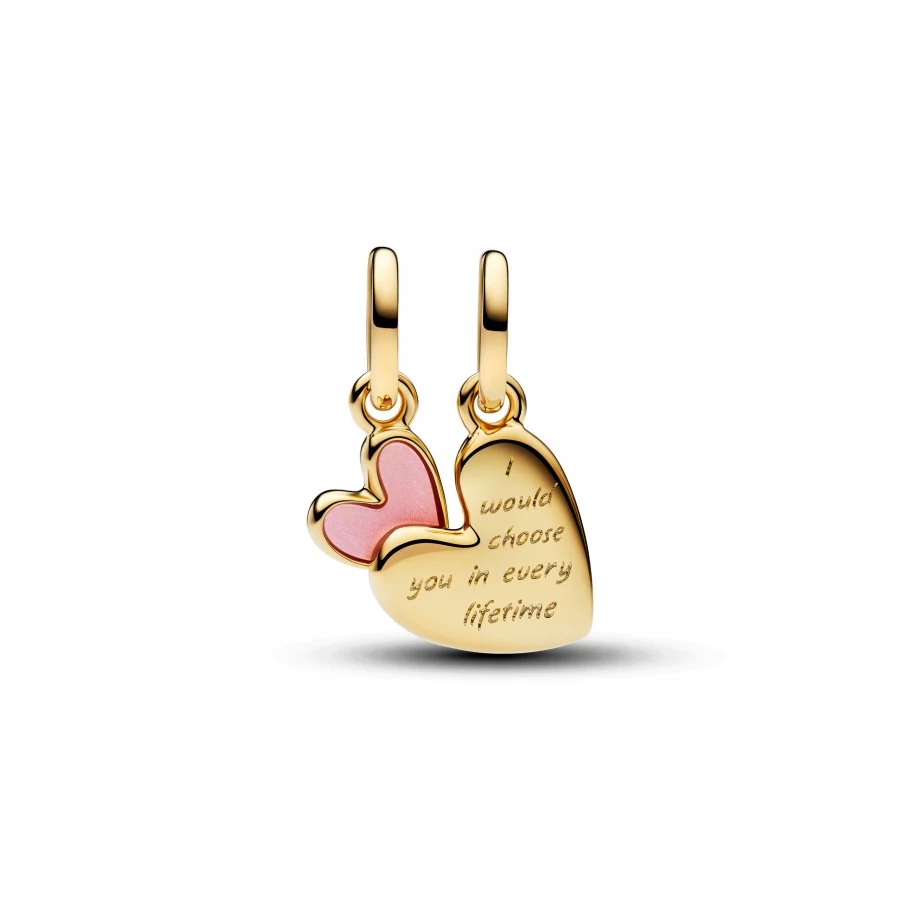 Ünnepeld az anyák és lányaik közötti kötelékeket! A 14 karátos arannyal futtatott, rózsaszín biogyanta mesterséges gyöngyházzal díszített ékszert a „mother”, a „daughter” és a „I would choose you in every lifetime” gravírozás díszíti.