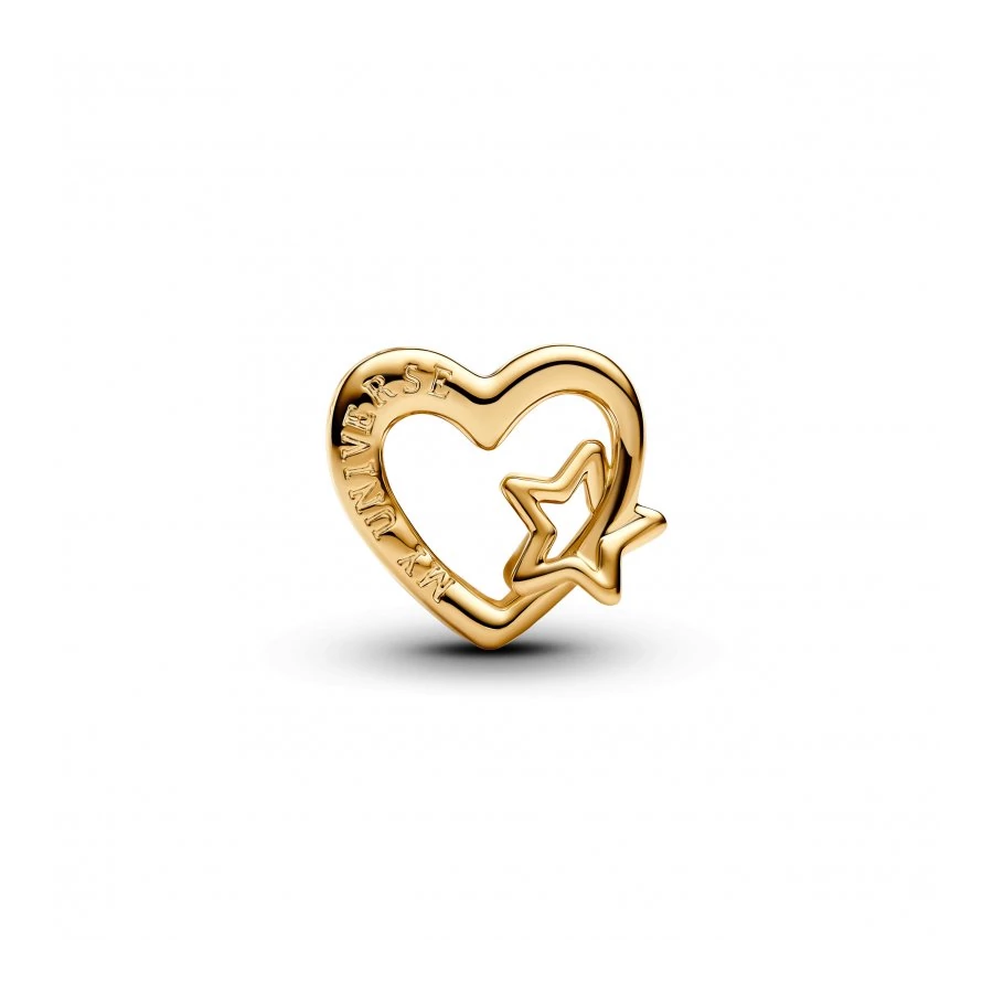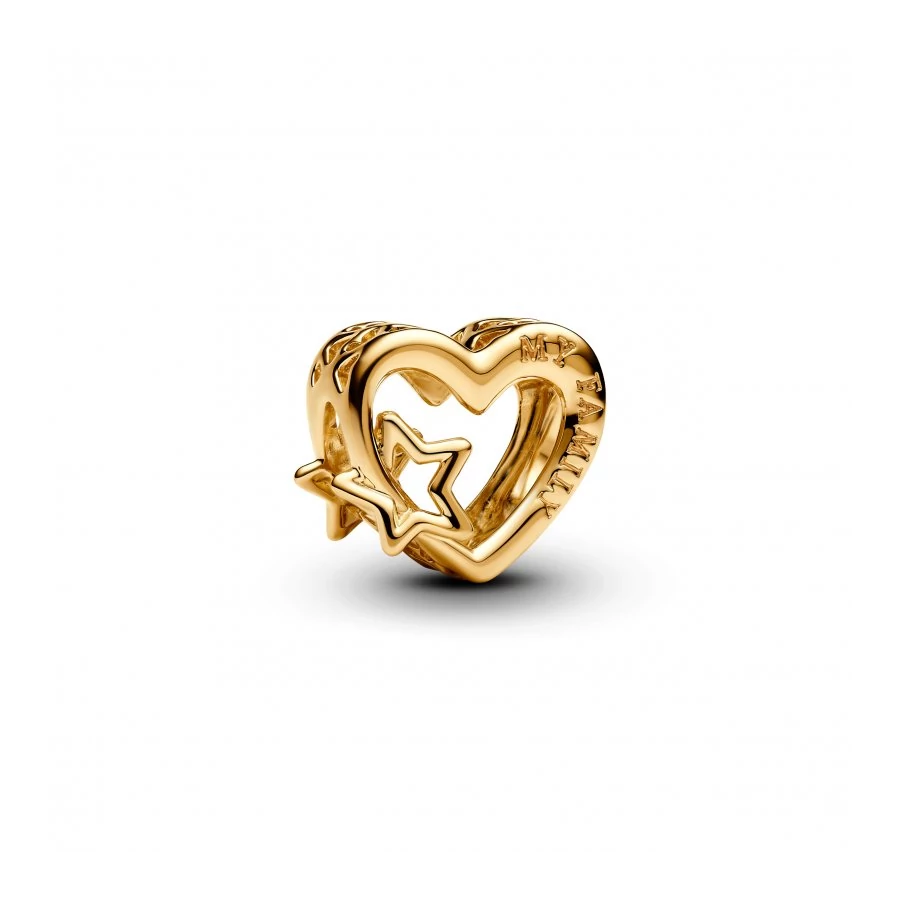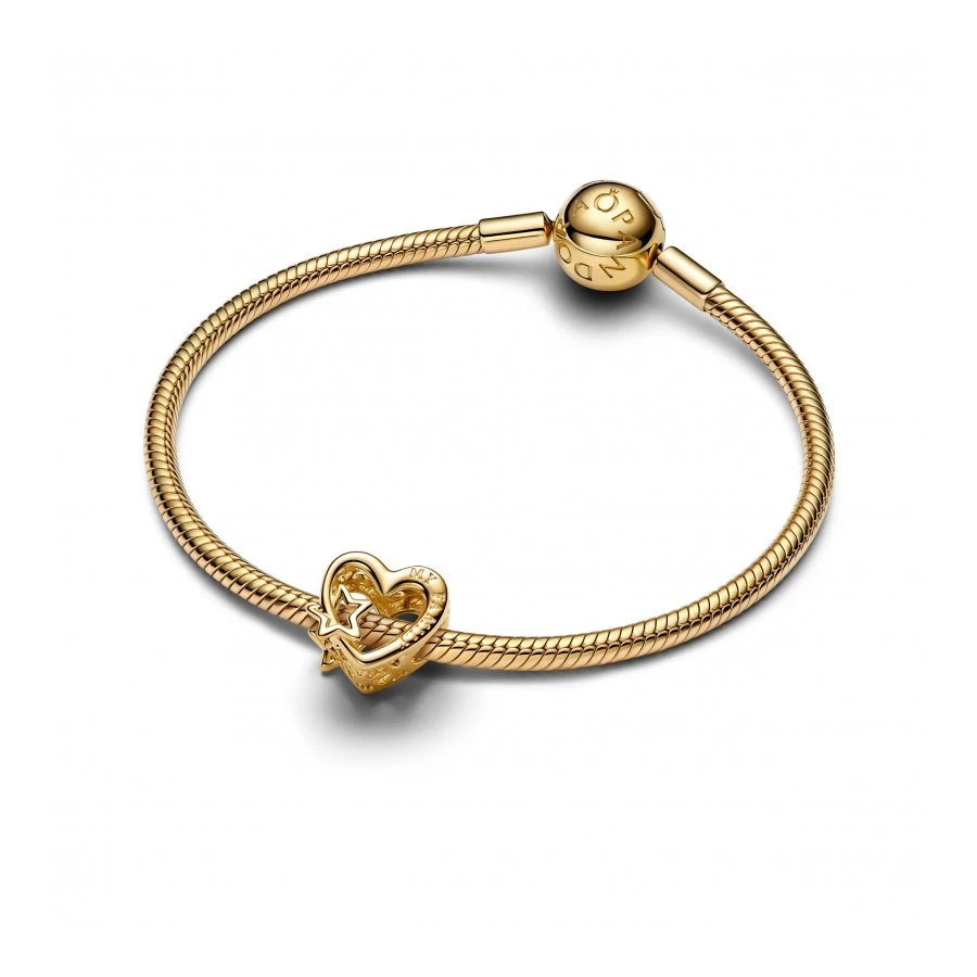 Mutasd ki érzéseidet az Áttört családi szív és csillag charmmal! Szív és csillag motívumok díszítik a legújabb Pandora Moments charmokat, szimbolikájuk pedig a család fontossága előtt tiszteleg. Ajándékozd saját magadnak vagy valakinek, akit szeretsz! A charm oldalán kivágott szívek, a szív két oldalán pedig egy-egy nagyobb kivágott csillag látható. Két kedvelt motívum találkozik, hogy létrehozzanak egy olyan 14 karátos arannyal futtatott charmot, amely (majdnem) olyan fényesen ragyog, mint azok, akiket a legjobban szeretsz.