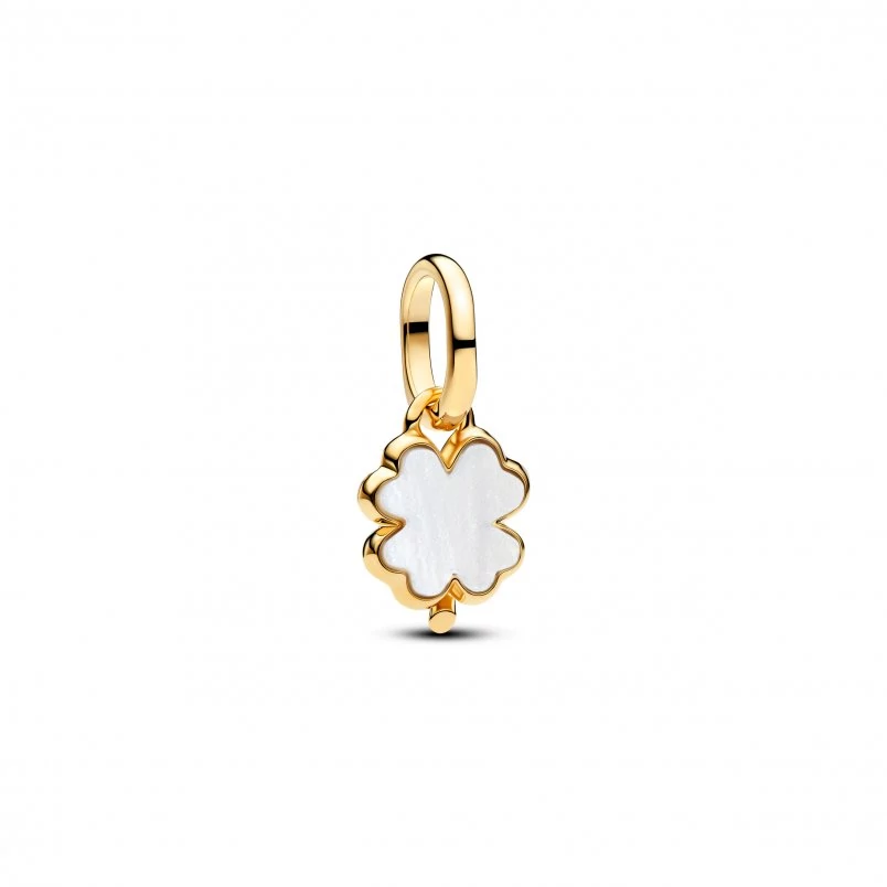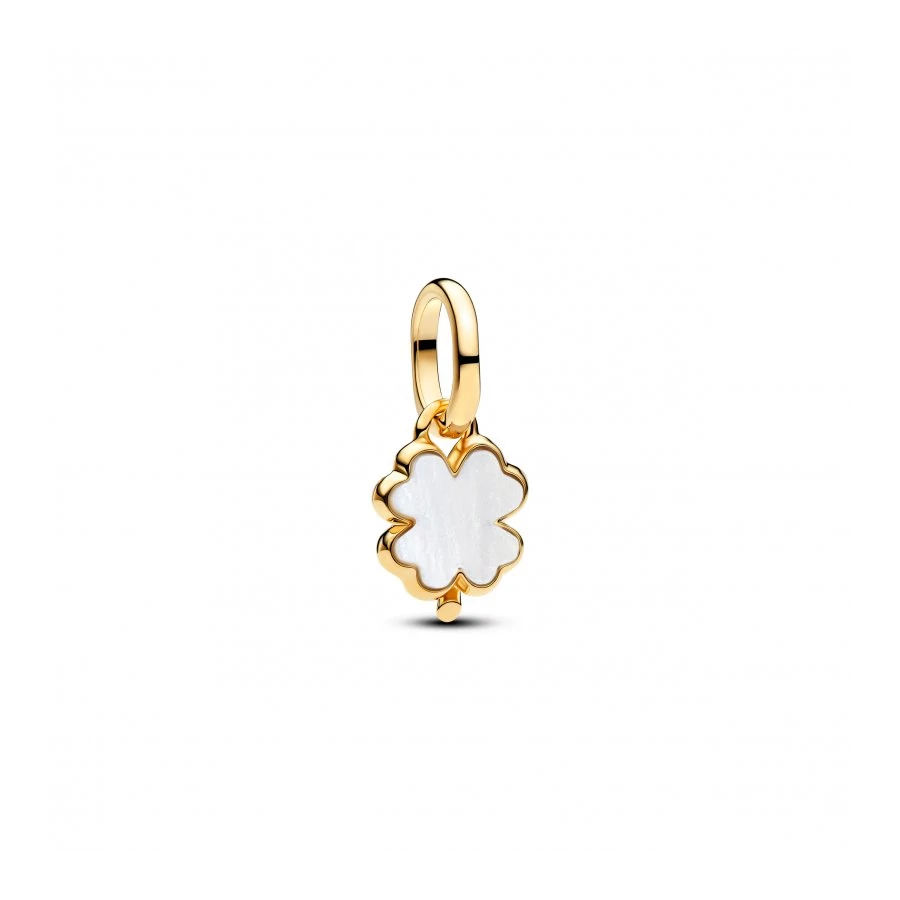 Vigyél egy csipetnyi szerencsét a megjelenésedbe fehér lóhere charmunkkal! A 14 karátos arannyal futtatott, fehér biogyanta mesterséges gyöngyház lóherével díszített függő charm segítségével elbűvölő módon adhatod hozzá a természet legszerencsésebb szimbólumát a kollekciódhoz.