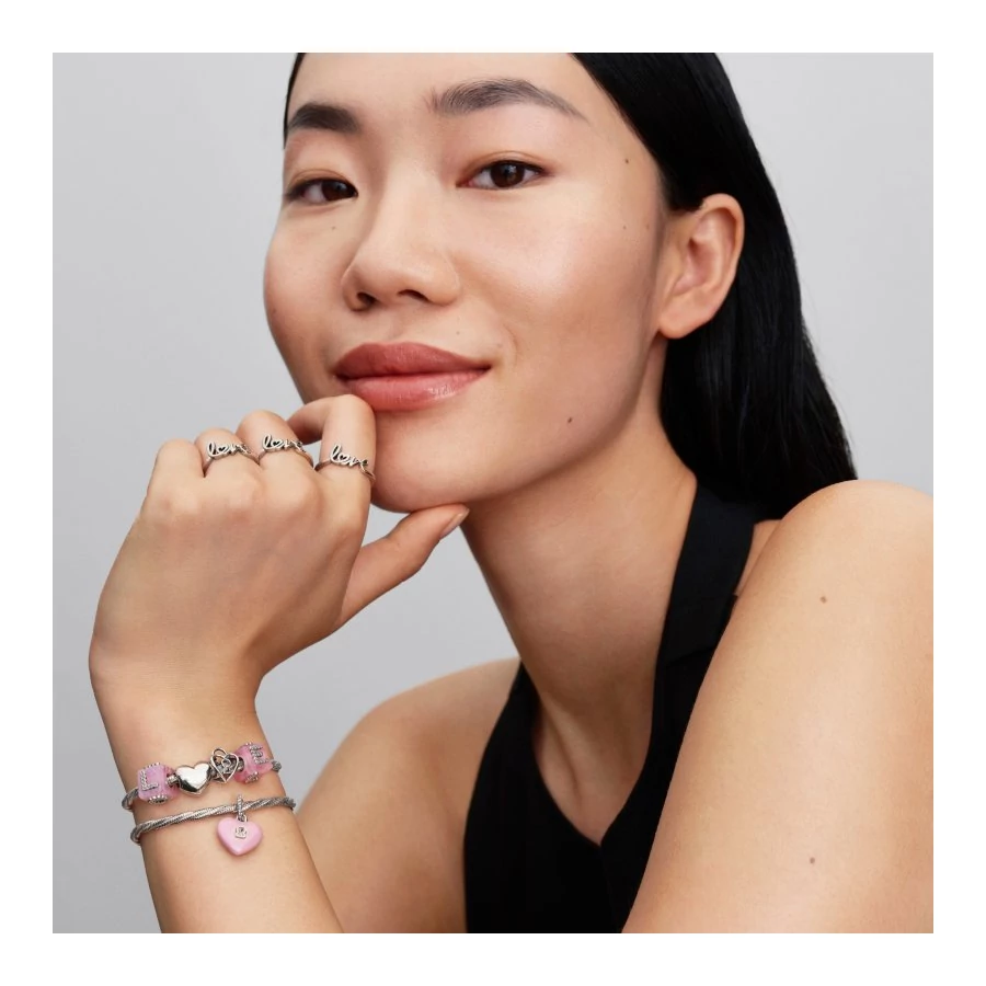 Mondd el minden oldalról! A sterling ezüst charm jellegzetessége egy rózsaszín muranói üvegből készült kocka a „LOVE” szó betűivel, melyek mindegyikét áttetsző cirkónia díszíti – egyszerű, erős és csupa szív üzenet.