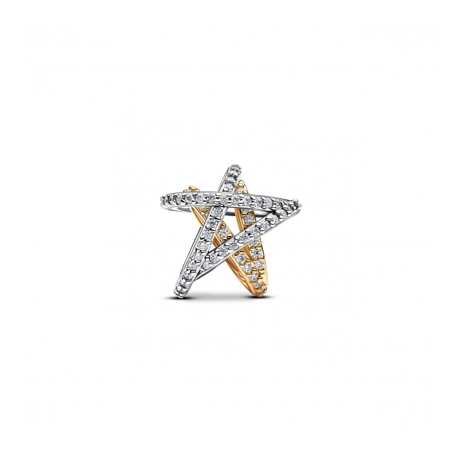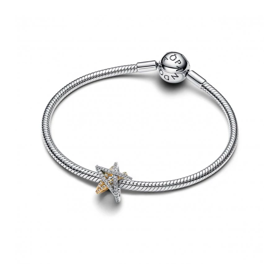 Szikrázó összefonódó csillag charm: Vigyél csillogást mindennapjaidba ezzel a sterling ezüstből és 14 karátos arannyal futtatott áttört csillag charmmal, amely pavé borítással ragyog. Tökéletes emlékeztető arra, hogy mindig fényesen ragyogsz, vagy ajándékként valakinek, aki egy kis extra örömöt érdemel.