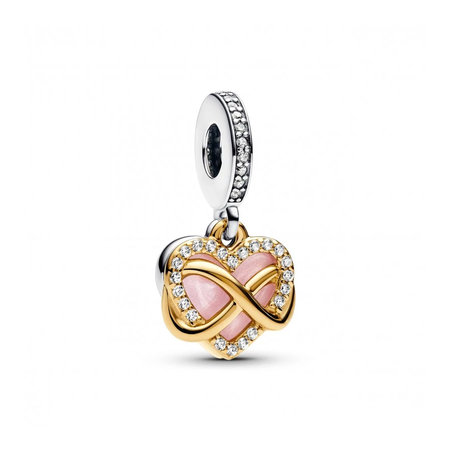 Mutasd meg érzéseidet a Szikrázó végtelenjel szív függő charmmal! A függő elülső oldala kézzel megmunkált 14 karátos arannyal futtatott, és a végtelenjelet egy áttetsző cirkóniával díszített szikrázó szív köré fonódva ábrázolja. A függő hátoldalát kézzel felvitt rózsaszín tűzzománc díszíti a „Family forever and always” gravírozás mellett.